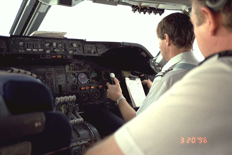 The Flight Engineer leans forward to assist